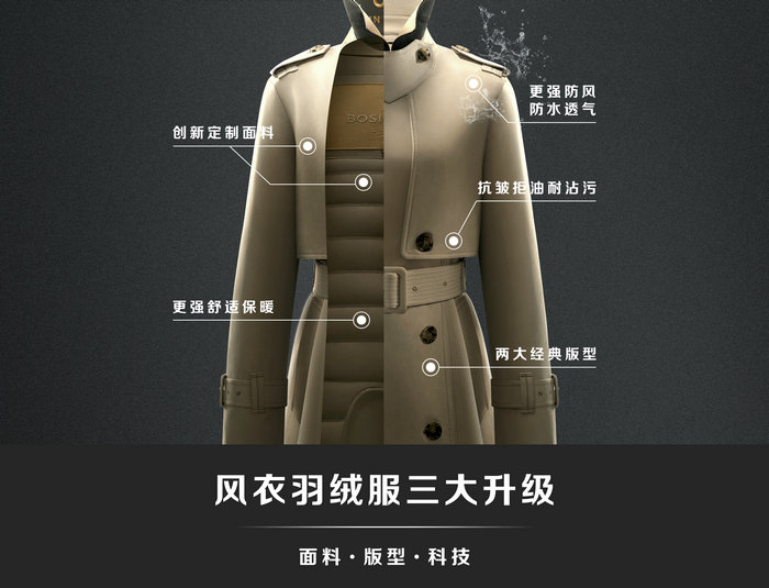 波司登风衣羽绒服厚植中国美学土壤,首次融合传统风衣设计及羽绒服保暖特性,在设计、工艺、面料、版型方面创新突破,一体式设计,分区直充绒,防风防雨抗皱功能性面料,立体3D建模修身剪裁亚洲版型,打造集时尚度、保暖性、修身型、正式感、防护力于一体的跨界御寒时装,开创羽绒服全新品类。2022年迭代创新,三大维度升级,六项功能突破,引领冬季商务时装变革。