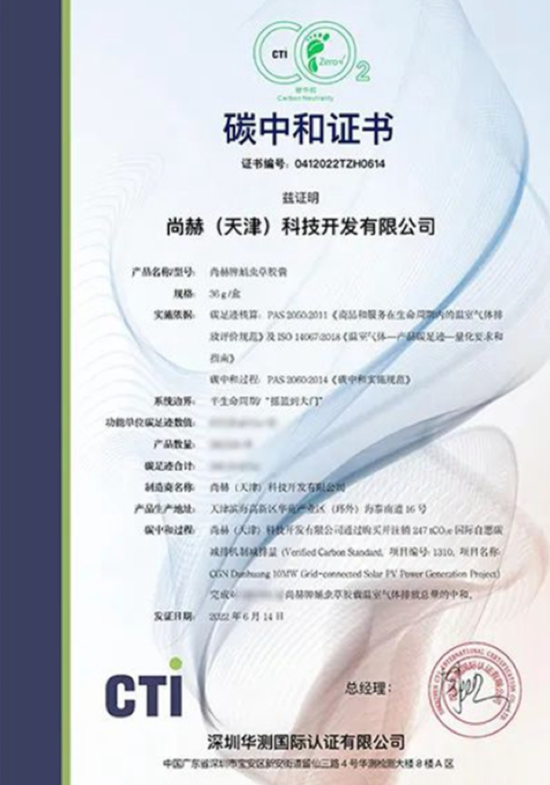 2022年6月,尚赫牌蛹虫草胶囊获得“碳中和”认证证书,该认证由中国合格评定国家认可委员会(CNAS)认可的第三方认证机构,按照国际通用标准,对尚赫牌蛹虫草胶囊的产品碳足迹(半生命周期)进行评价分析,尚赫牌蛹虫草胶囊也成为营养健康行业内最先获得“碳中和”认证的保健食品之一。