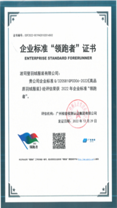 中国标准化研究院(China National Institute of Standardization)在“企业标准领跑者管理信息平台”公布2022年入选企业标准“领跑者”名单,波司登羽绒服装有限公司企业标准Q/320581GPC006-2022《高品质羽绒服装》经评定机构评估,入选2022年企业标准“领跑者”名单并获颁证书。波司登连续四年荣获企业标准“领跑者”证书,展现行业领先的企业技术标准,也将助力企业标准化战略纵深发展,增加中高端产品和服务有效供给,提升羽绒服专家品牌形象和市场竞争力,带动产业高质量发展。