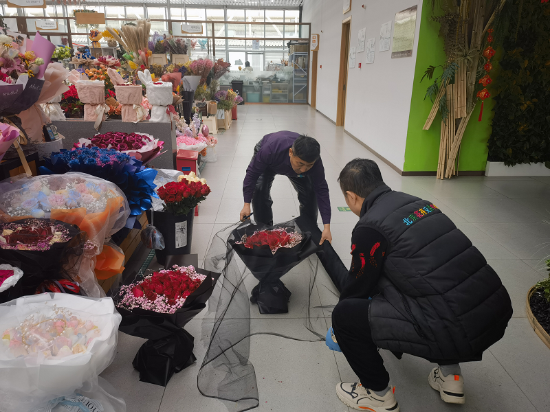 工作人员正在包装花束。(中国商报记者 冉隆楠/摄)