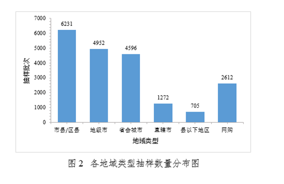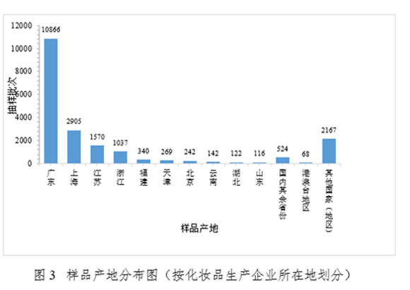 各省(区、市)药品监督管理部门组织对化妆品抽样的批次数量分布情况见图1。抽样采用现场抽样和网络抽样两种方式进行,抽样的区域分布情况见图2。样品的产地分布情况见图3。
