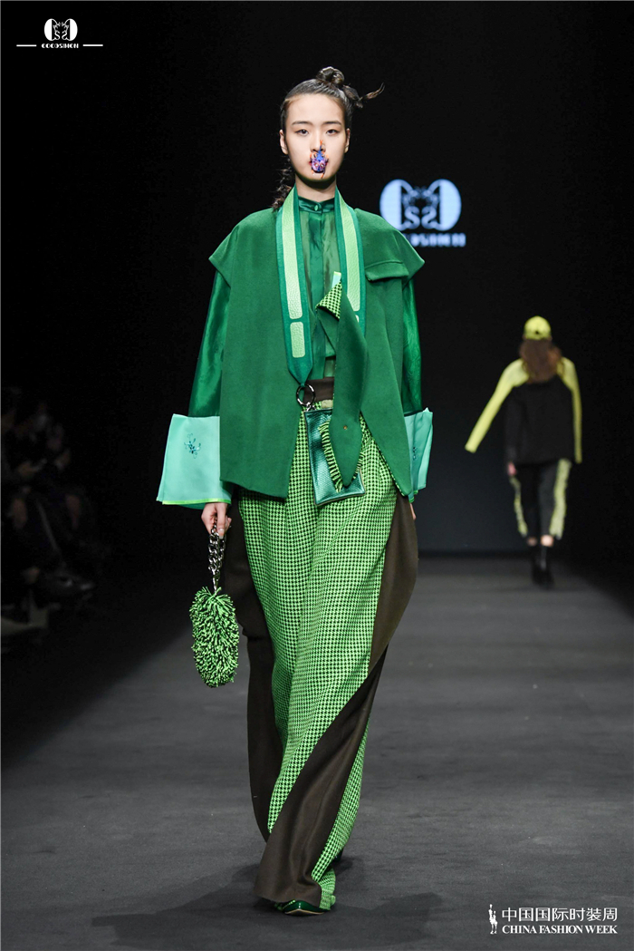 大秀开场,伴随着清脆的鸟叫虫鸣,身着COCOSIMON高级成衣的模特登场。剪裁利落的造型上,一只只立体的昆虫装饰在模特的展示下带给观众与众不同的视觉冲击。