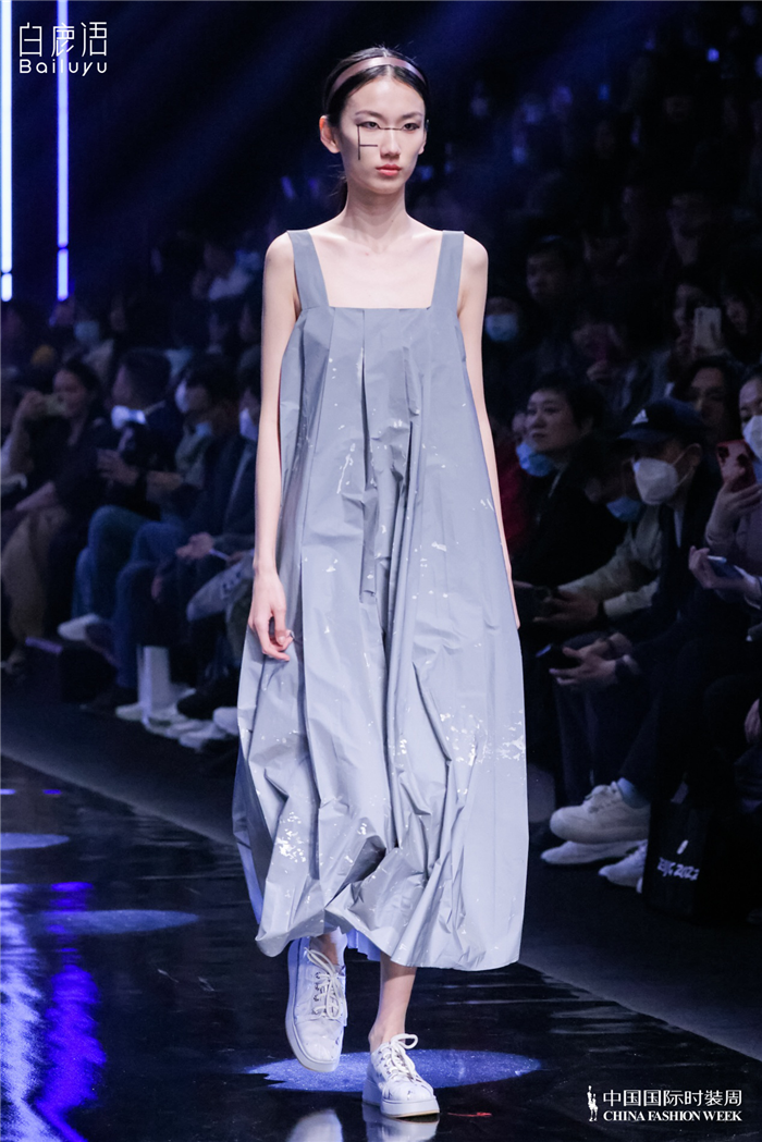 赵晓妹的设计呈现出一种冷峻的美学语言。无论是肩部与裙摆处的不对称设计,还是充满流动感的水滴袖,都试图深入探索和解读“无序”与“秩序”之间的关系。