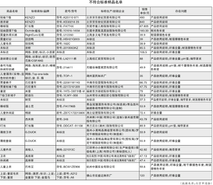 其中,标称“耐克”品牌针织长裤样品,产品使用说明、纤维含量、绳带要求、耐湿摩擦色牢度不达标。标称“迪士尼”品牌棒球服样品,产品使用说明、耐湿摩擦色牢度不达标。标称“真维斯”品牌卫衣和休闲裤样品,产品使用说明、纤维含量不达标。标称“巴布豆”品牌儿童上衣样品,产品使用说明、纤维含量、耐干摩擦色牢度、耐湿摩擦色牢度不达标。(记者 万晓东)
