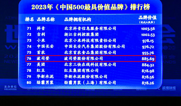 在这份基于财务数据、品牌强度和消费者行为分析的年度报告中,波司登凭借品牌建设成就和在各领域的创新实践,入选“中国500最具价值品牌”,2023年品牌价值评估达885.69亿元,排名跃升至第76名,品牌实力和影响力领跑纺织服装行业。