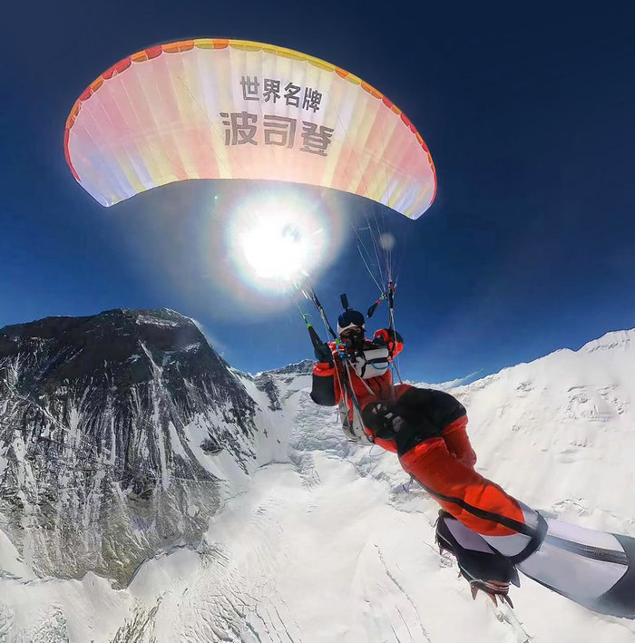 为纪念人类首次登顶珠峰70周年,2023年5月18日9时14分,中国波司登珠峰登山队队员木子(李生涛)从珠穆朗玛峰海拔8000米的南坳,使用无动力单人滑翔伞起飞,经过20多分钟的飞行,安全降落在预定区域,创造了中国滑翔伞飞行员的起飞高度纪录,为波司登助力登峰事业再添浓墨重彩。