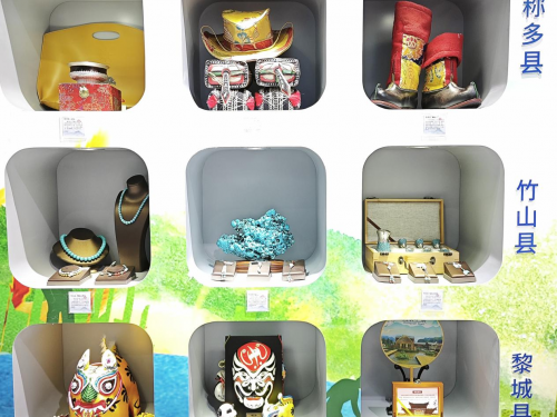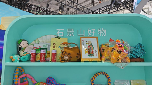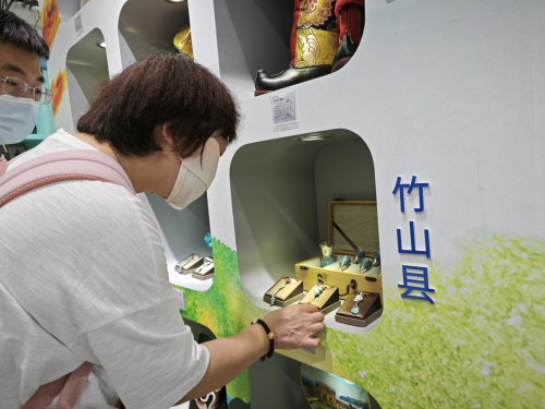 展会期间,位于服贸会首钢园区2号馆的竹山文旅商品展位前人头攒动,各种精美的竹山绿松石饰品,和印有“传说自然在竹山”IP标识的“竹潇潇·绿宝”原型国风玩偶、手工团扇等特色文旅商品,受到世界各地游客的喜爱。