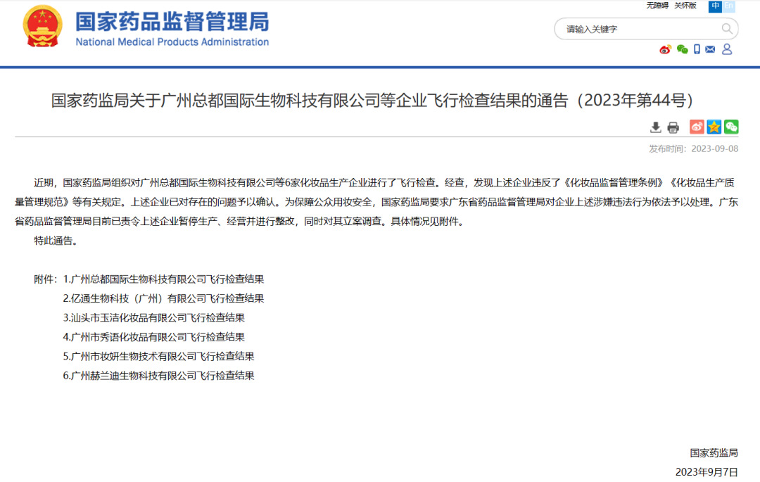 近期,国家药监局组织对广州总都国际生物科技有限公司、亿通生物科技(广州)有限公司、汕头市玉洁化妆品有限公司、广州市秀语化妆品有限公司、广州市妆妍生物技术有限公司、广州赫兰迪生物科技有限公司等6家化妆品生产企业进行了飞行检查。经查,发现上述企业违反了《化妆品监督管理条例》《化妆品生产质量管理规范》等有关规定。上述企业已对存在的问题予以确认。