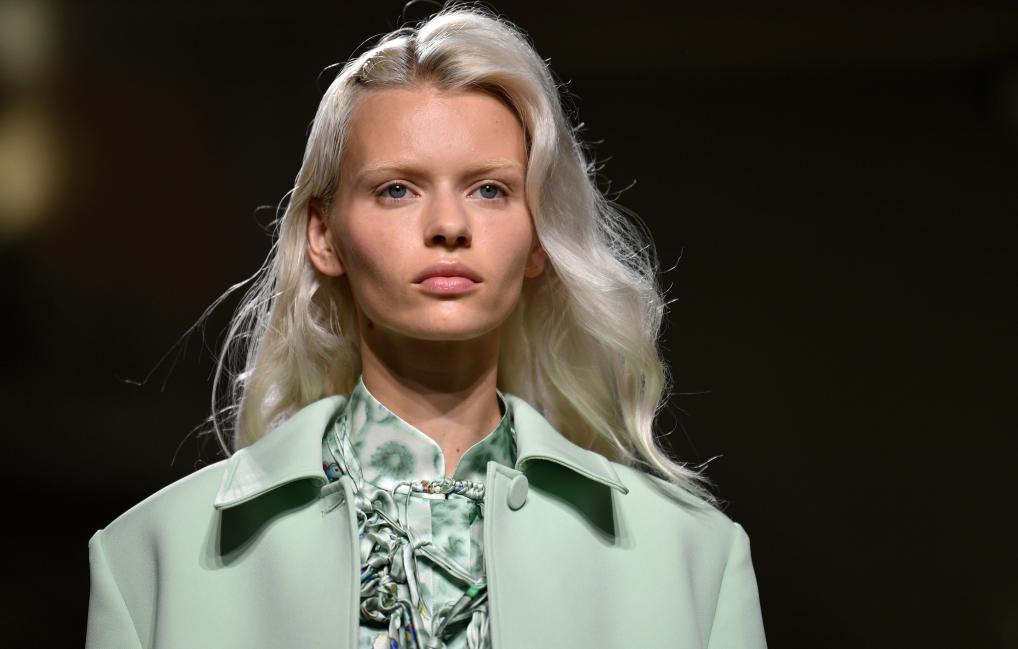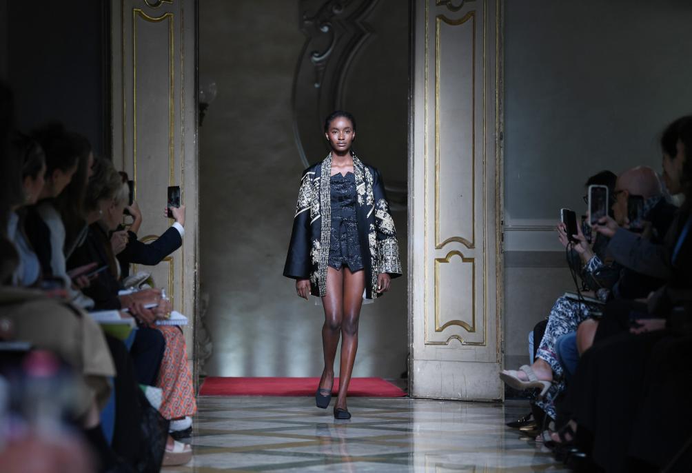 9月24日,模特在意大利米兰时装周上展示含有贵州苗绣元素的设计时装。