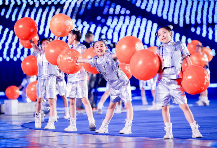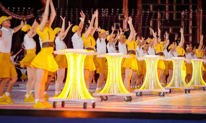 设计师丁洁此次将青春、奔放的主题融合水墨画晕染、水韵江南的元素,尤其是在女演员粉红服装设计中,流线型的水元素和运动的立体风格演绎,以层层叠叠的面料解构组合,将本届亚运“超越共融”的服装风格定位精准体现出来。丁洁还介绍说:“《新潮向未来》演员服装运用了少许紧身的廓形设计,体现年轻积极向上的勃勃生机。水墨晕染之下,金灿灿的整体色彩凸显金秋丰收的盛况,也是籍由设计的力量,展现当下的中国倡导绿色低碳,高质量发展的新成效。”