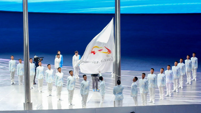 9月23日,身着丁洁设计的会旗升旗及护旗手在开幕式上。