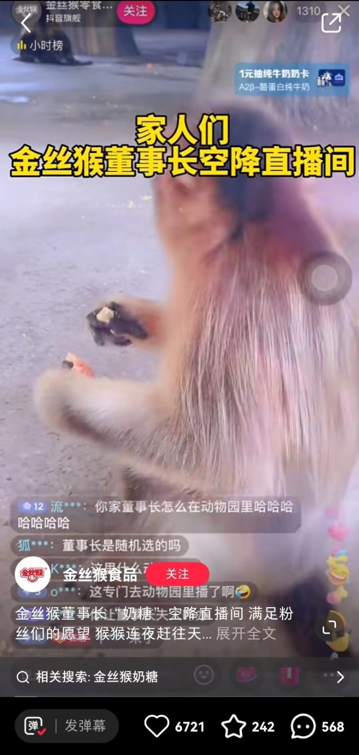 “猴猴连夜赶往天津动物园,给大家带来董事长‘奶糖’的现场直播”,紧随“白猫董事长”走红网络的脚步,金丝猴食品将直播的镜头对准了其认养的川金丝猴;白象生鲜也把直播间搬到了郑州市动物园的大象馆;自称“商战新手”的喔喔糖果直播间请来了一只大公鸡;雕牌主播则戴上毛绒头套cos成了一只雕……