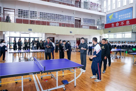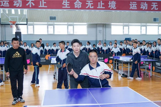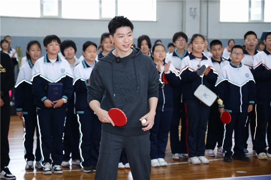 在趣味互动前,马龙向学生们讲解了乒乓球基本的技巧,并手把手指导到场学生,纠正技术动作,传授个人经验,同学们也抓住和奥运冠军互动的难得机会,积极提问与交流。