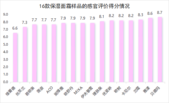 在感官评价方面,测评员在无法辨别品牌和样品名称的情况下,用同样的方法使用所有测试样品,对样品的质地、易吸收程度、使用后皮肤光滑度、滋润度、油腻感和气味进行评价,每个样品统计30份有效评估数据,满分为10分。结果显示,标称品牌为贝德玛、雅漾样品的感官评价综合得分均为8.5分以上;标称品牌为维蕾德样品的感官评价综合得分最低,体验感较差。标称品牌为贝德玛、欧树、雅漾、兰蔻样品的质地最受欢迎,被认为能给肌肤带来柔软感觉;标称品牌为欧树、雅漾、贝德玛样品被认为容易吸收;标称品牌为欧树、优姿婷、贝德玛、雅漾样品涂抹后皮肤光滑度较好;标称品牌为欧树、贝德玛、优姿婷样品使用后给皮肤带来滋润保湿的感觉较明显;油腻感主要是产品中的油脂度决定的,一般来说偏干性皮肤更愿意选择油腻感高的产品,标称品牌为欧舒丹的样品被认为相对油腻或粘稠;标称品牌为兰蔻、雅漾、薇姿、贝德玛样品的气味令人感到愉悦,得分较高。