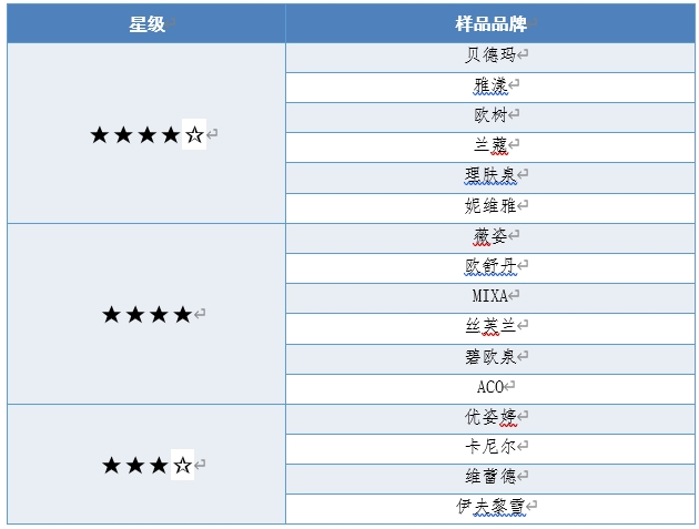 16款保湿面霜样品星级评价情况