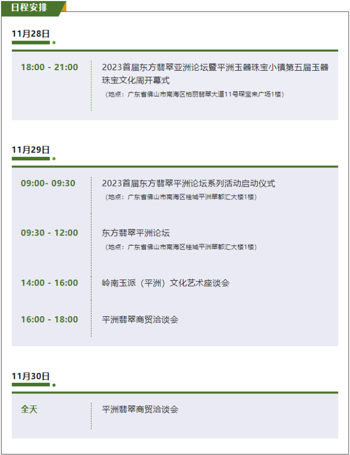 本次论坛系列活动包括《东方翡翠(平洲)产业发展的机遇》报告发布、东方翡翠平洲论坛、岭南玉派(平洲)文化艺术座谈会、平洲翡翠商贸洽谈会等内容。论坛系列将汇集行业优势资源,以报告、演讲、对话、研讨、考察、洽谈等形式开展,从行业发展、学术趋势、商业潮流、玉器创作、文化传承与创新、品牌建设、产业升级等多个角度进行深入探讨,交流,促进、支持平洲翡翠珠宝玉石首饰产业发展。
