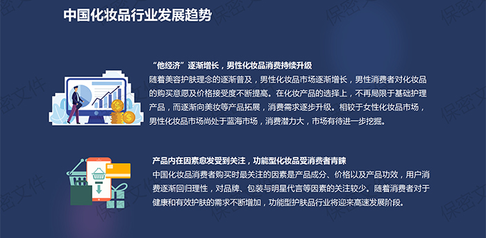 报告对未来中国化妆品行业发展趋势进行了前瞻分析。报告显示,男性化妆品消费持续升级。随着美容护肤理念的逐渐普及,男性化妆品市场逐渐增长,男性消费者对化妆品的购买意愿及价格接受度不断提高。在化妆产品的选择上,不再局限于基础护理产品,而逐渐向美妆等产品拓展,消费需求逐步升级。相较于女性化妆品市场,男性化妆品市场尚处于蓝海市场,消费潜力大,市场有待进一步挖掘。