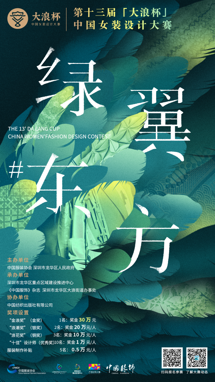 第十三届“大浪杯”中国女装设计大赛乘着新风振翅而来,以“绿翼#东方”为主题,为中国本土设计力量开启向上攀登的大门,站在粤港澳大湾区时尚高地,向着现代化产业体系建设新征程奋进。