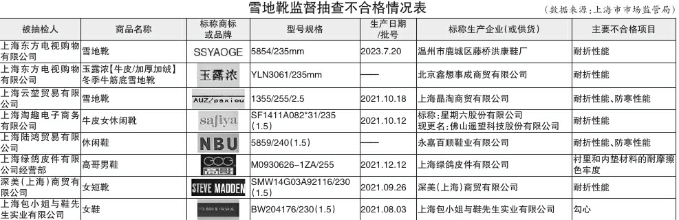 针对消费者投诉举报集中及质量问题较多的产品,近日,上海市市场监管局对线上、线下30家企业销售的40批次雪地靴进行了监督抽查。经检测,有8批次不合格,不合格检出率为20%,涉及SSYAOGE、GOG高哥等品牌。