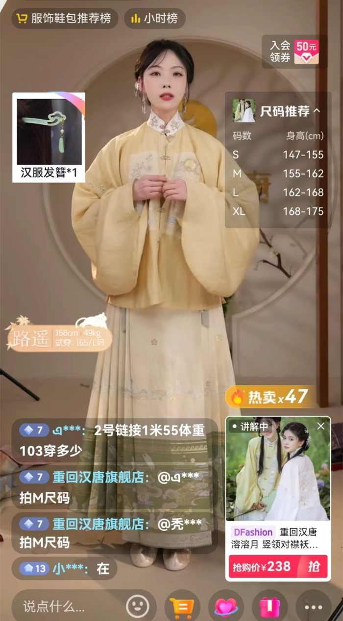 晓燕是忠实的汉服爱好者,她对记者说:“我会购买一些原创设计、工艺复杂的汉服单品,由商家量身定制,一件售价在千元以上。面料多选择织金、仿妆花、化纤罗等,款式多选择古代复原款。现在购买汉服的人越来越讲究,每个细节都会注意。”