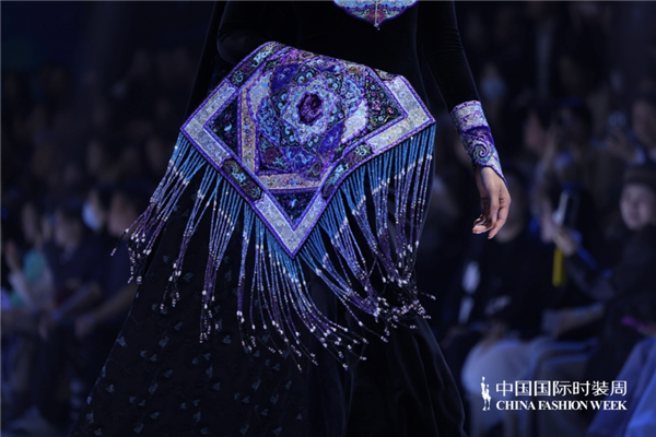 服装设计师提取苗绣文化的花纹与色彩元素,结合纹案温润流畅的廓形,通过主调蓝、青、红、紫等颜色,带来新一季的中式华服美学。