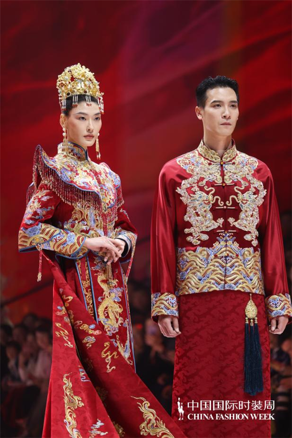 六礼LOOLAYY本次产品系列融入“苗银蜡染”“剪纸文化”以及“踏虎凿花”等非遗文化元素,丰沛品牌独有的设计语言,增添了一层悠久中华文化的底蕴。系列还特别引入了鸵鸟毛、贴补绣、复古蕾丝以及纯手工钉珠等工艺手法,与新型面料和天然面料相结合,呈现出多层次的视觉效果。充满象征意义的刺绣图案仿佛从悠久的历史中走来,为系列注入了浓郁的艺术气息。带领观众沉浸式领略中华国服之美,彰显“中国婚俗文化传承者与发扬者”的目标与人文匠心。