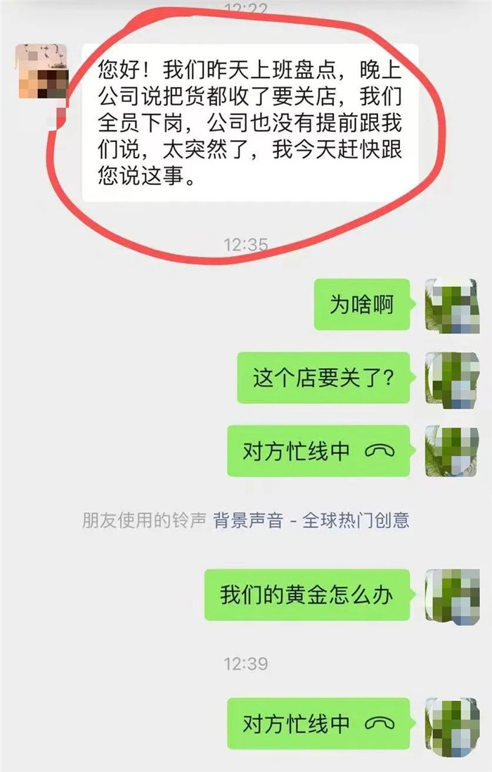 2023年12月27日上午,中国黄金北京双井富力广场门店店员周茉突然接到管理人员的电话,说门店已关闭,她不用再去上班。“前一天还在正常工作,(管理人员)还让我们盘货(清点货物)。”
