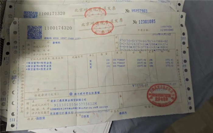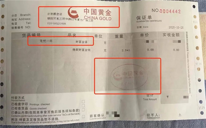 购买黄金后,门店开具的保证单。受访者供图