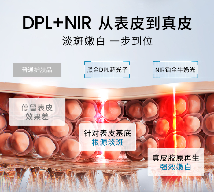 常见院线淡斑嫩肤光学仪器通常只具备单一的DPL超光子技术,或者只配备单一的NIR牛奶光技术,而单一功能的局限性无法满足用户对全面肌肤护理的需求。而即使某些设备同时配备了DPL和NIR两种光源,它们往往无法同时亮起并发挥作用,并且需要前往院线接受护理,这限制了护肤效率与护肤效果最大化。