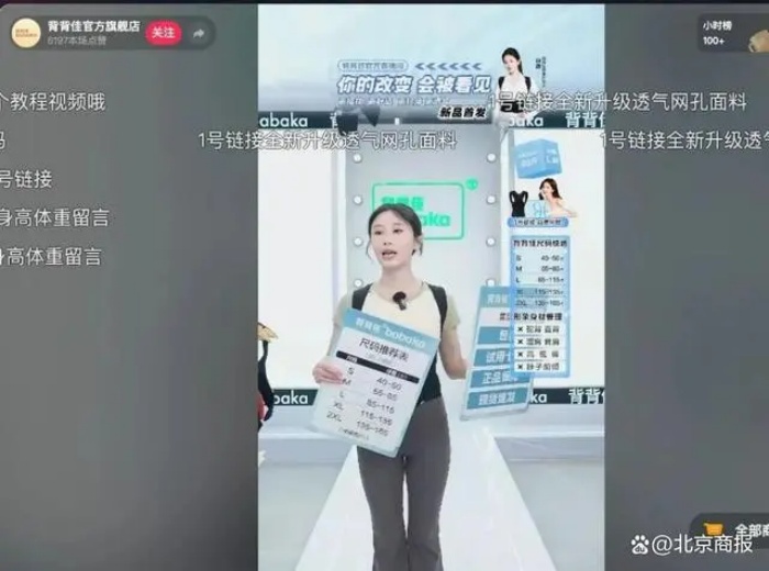 据中新经纬,蝉妈妈平台显示,背背佳有三个官方账号,近一周内,三个官方账号的直播场次分别达到8次、9次和8次,绝大部分场次直播时长超过四小时。蝉妈妈平台显示,5月8日,背背佳旗下产品跻身医疗保健品类直播商品榜第一位,近90天累计销售额突破1亿(该平台算法最多显示金额为1亿元)。