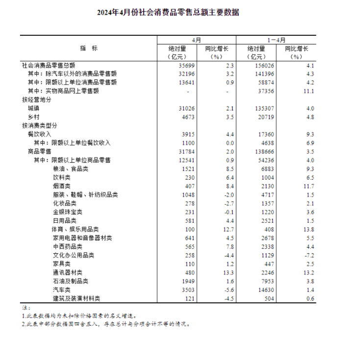 2024年4月份社会消费品零售总额主要数据。(图片源自国家统计局官网)