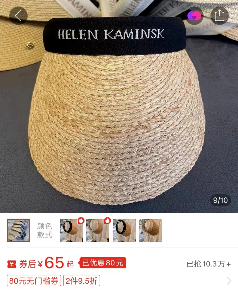 比如澳洲品牌HELEN KAMINSKI空顶草帽,董璇、章若楠都戴过它出镜。拉菲草材质,印有品牌logo的徽标松紧带……看起来平平无奇,却被网友调侃“一帽顶十帽”。
