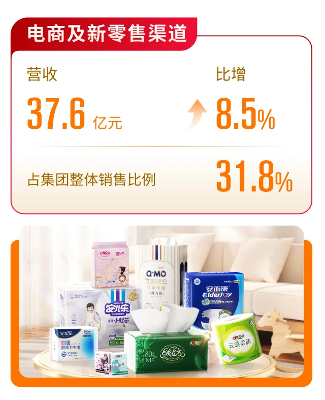 随着线上线下融合的消费新模式和新业态的加速发展,消费潜力持续释放。上半年,集团电商及新零售渠道(包括零售通及新通路)保持强劲发展势头,销售收入增长8.5%至37.6亿元,占集团整体销售上升至31.8%。新零售渠道对纸巾业务、卫生巾业务及纸尿裤业务的销售贡献分别约36.4%、约25.6%及约53.5%,未来新零售渠道的销售比重可望进一步上升。