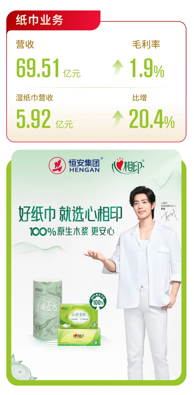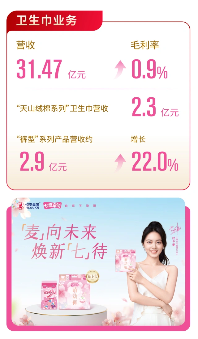 卫生巾业务营收31.47亿元,占整体收入约26.6%。为了提升品牌形象并巩固在中高端市场和传统销售渠道的领先地位,恒安持续推进产品升级和高端化布局,以满足消费者对高质量卫生护理用品的需求。其中新升级卫生巾产品如“萌睡裤”系列及去年下半年推出的高端产品“天山绒棉”系列,凭借优良的质量和品牌形象,深受消费者青睐。