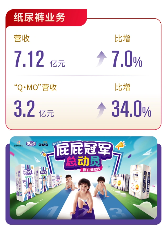 纸尿裤业务销售上升7.0%至7.12亿元,毛利率大幅上涨至约45.3%。集团不断研发优质婴儿及成人健康护理产品,以迎合消费者日益升级的产品质量需求。期内,“Q•MO”高端品牌销售保持良好增长,同比增长接近约34.0% ;安儿乐品牌成功转型至“运动型”系列有效提升销售;另一方面,集团成人纸尿裤业务受惠于国内成人失禁用品市场规模日益壮大,市场份额稳步提升。