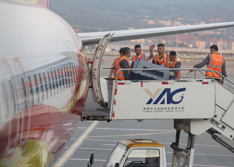 昆明长水机场,工作人员将装有大型犬的航空箱从飞机客舱后门搬运。