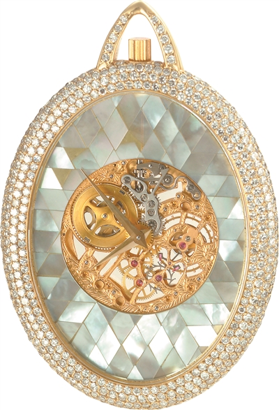 珍珠母贝表盘女士黄金镶钻吊坠表,椭圆形表壳,来自1978年的品牌作品。