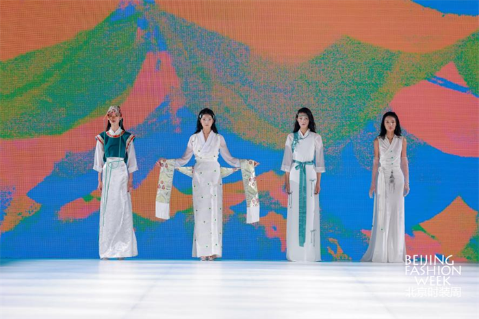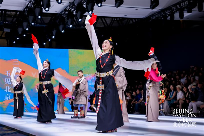 当晚,璀璨登场的“三江源起‘玉’见北京”主题大秀,在聚光灯下如梦如幻。模特们身着由清华大学美术学院教授、博士生导师李薇精心设计的玉树文化主题服饰,每一步都踏出了三江源的万千风情。依托首都优势资源,本次闭幕大秀以设计为媒,强化玉树文化品牌培育,深度挖掘了玉树绚烂丰富的文化内涵,进一步推动两地产业互动与人才交流,引领玉树时尚文化迈向更为广阔空间。