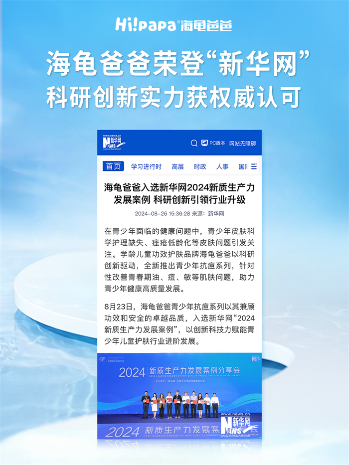 近日,海龟爸爸青少年抗痘系列以其兼顾功效和安全的卓越品质,入选新华网“2024新质生产力发展案例”,科研创新实力获权威认可,以全链路科学抗痘方案,针对性改善青春期油、痘、敏等肌肤问题,以品牌自身的专业属性守护青少年肌肤,助力青少年健康高质量发展。