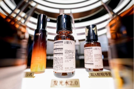会上,HBN 精心搭建的品牌空间延续了复古实验室的基调,绿植、方/圆型原木柜台等元素的搭配,结合牛油果绿的主体色,意在探索复古调性与现代内核的平衡;圆环形展台上的透明玻璃圆管与台上的琥珀色玻璃瓶产品相互呼应,体现科学与美感上的内在统一,打造持久可见的科研美学。