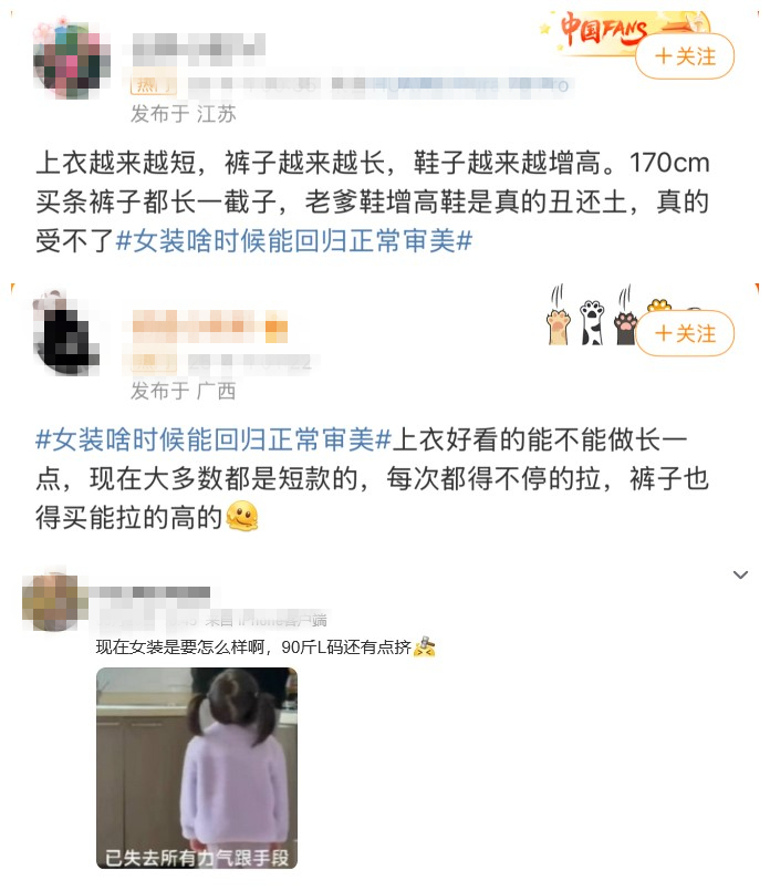 上衣越来越短、裤子越来越长、90斤的女生只能穿L码……近日,“女装啥时候能回归正常审美”话题登上热搜,这已经不是消费者第一次吐槽女装尺码问题,为何依旧无解?