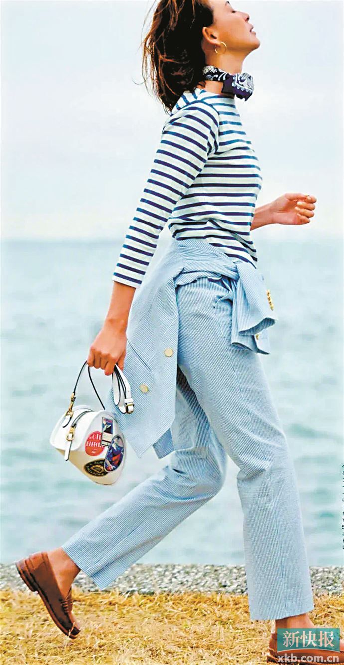 另一充满“航海味”且又比较“日常”的单品则属条纹衬衫,宽松版型更符合这一风格的调性,无论是搭配高腰短裤还是伞裙,配一双麻底帆布鞋,都能一秒拥有海边假期的氛围感。搭配同样宽松廓形的蓝色休闲西装则显得刚柔并济,松弛而不松散。