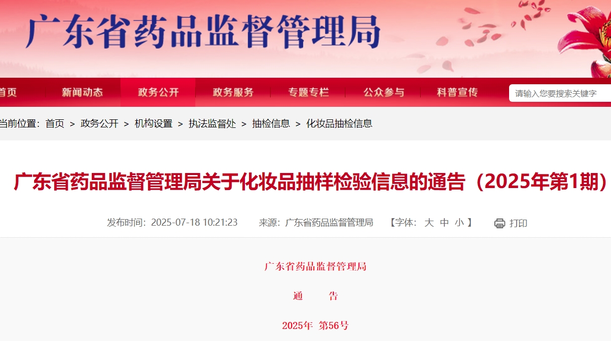 为加强化妆品监管,保障公众用妆安全,根据广东省化妆品抽检计划,广东省药品监督管理局组织对全省化妆品生产经营环节进行化妆品抽样检验,现将化妆品抽样检验信息予以通告(见附件)。
