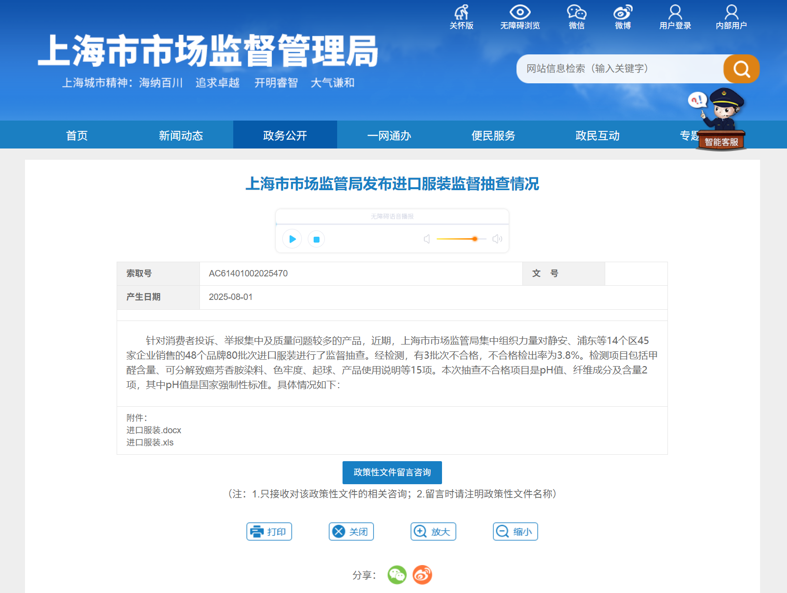 针对消费者投诉、举报集中及质量问题较多的产品,近期,上海市市场监管局集中组织力量对静安、浦东等14个区45家企业销售的48个品牌80批次进口服装进行了监督抽查。经检测,有3批次不合格,不合格检出率为3.8%。检测项目包括甲醛含量、可分解致癌芳香胺染料、色牢度、起球、产品使用说明等15项。本次抽查不合格项目是pH值、纤维成分及含量2项,其中pH值是国家强制性标准。