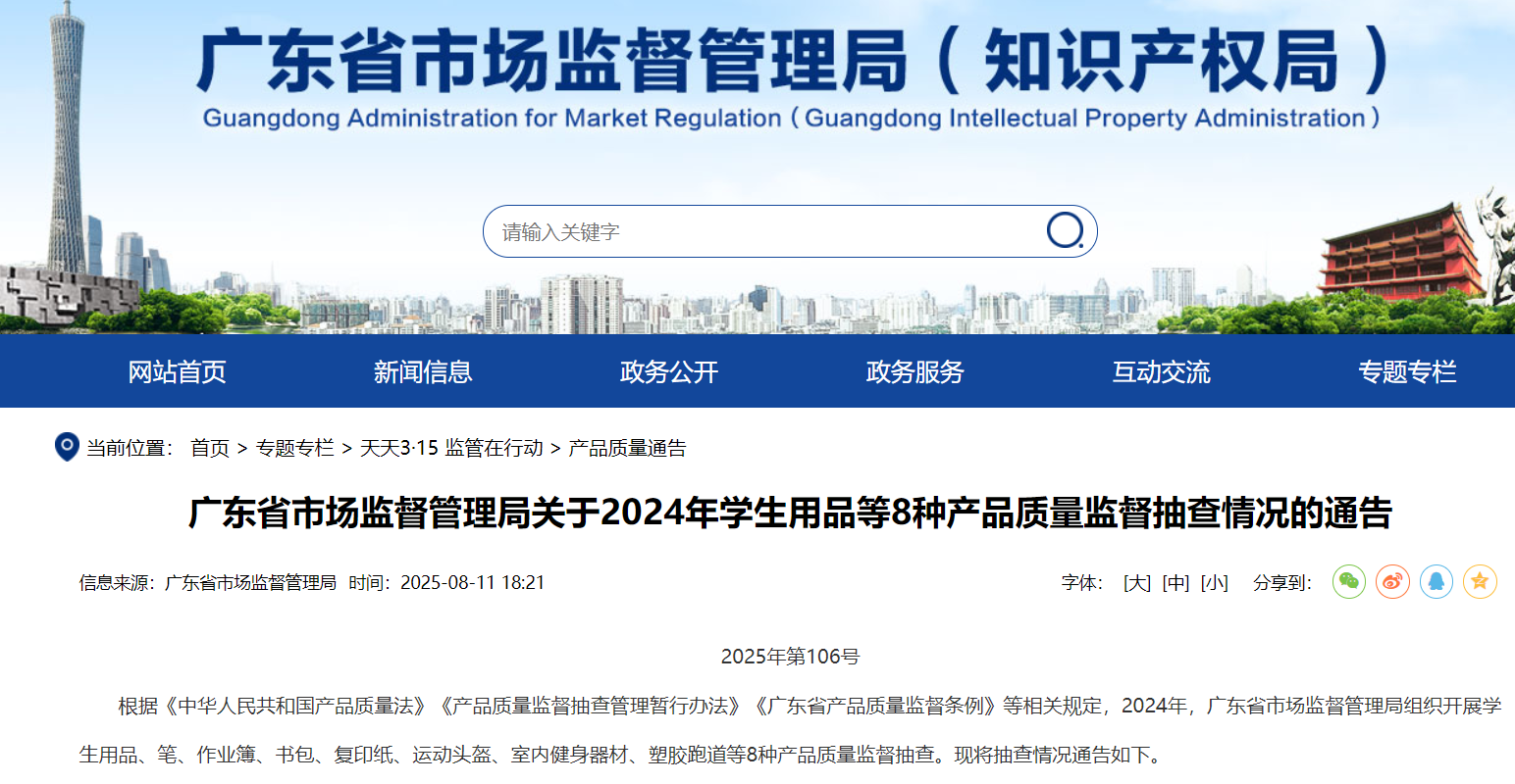 根据《中华人民共和国产品质量法》《产品质量监督抽查管理暂行办法》《广东省产品质量监督条例》等相关规定,2024年,广东省市场监督管理局组织开展学生用品、笔、作业簿、书包、复印纸、运动头盔、室内健身器材、塑胶跑道等8种产品质量监督抽查。现将抽查情况通告如下。