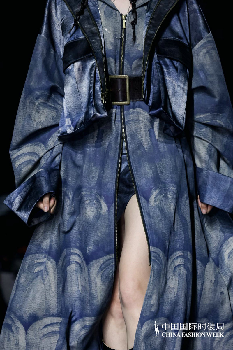 设计师以中原服饰形制为基础,巧妙融入胡服领、束口裤等标志性元素,将云冈石窟的卷云纹、夔龙纹、莲花等经典纹样进行抽象化再设计,以剪花工艺表达魏碑狂草般的流云变体,展现北魏飘逸、狂野的气质,呈现出刚柔并济的融合韵律。本系列延续了ZIFEI WANG暗调色彩表达方式,将刺绣与皮革所展现出的岩壁粗粝感融合,形成人文与自然的反差碰撞,细腻复现出独属于塞北边境的厚重与狂野。部分款式中偶现的点睛蓝色,为后续序列埋下伏笔。