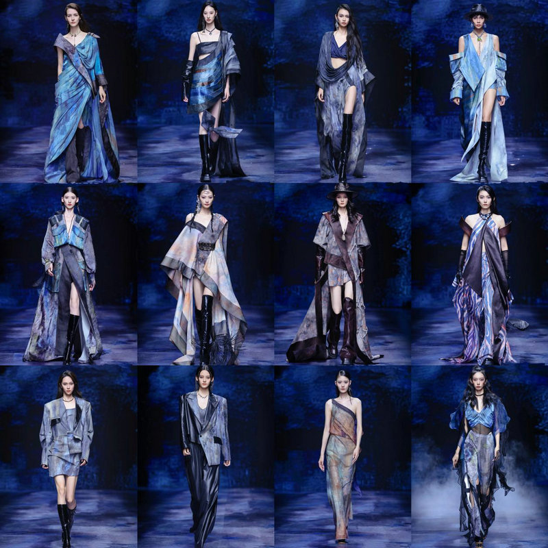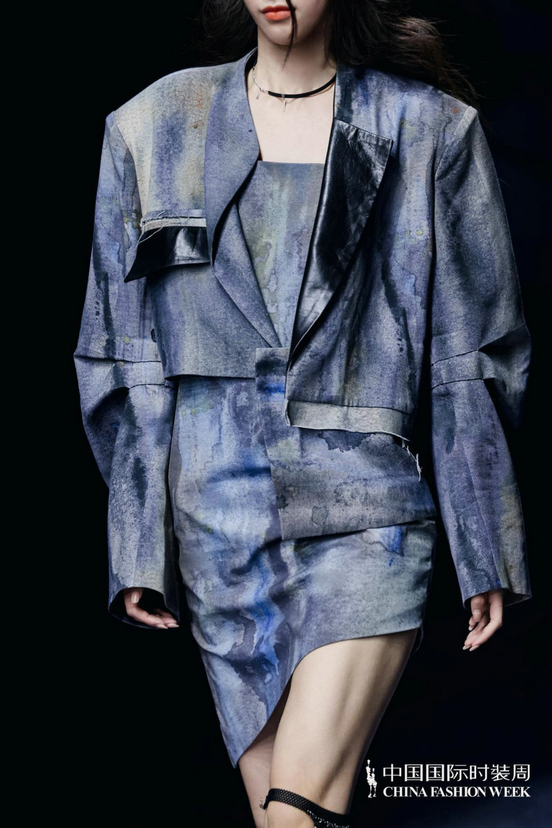 为了更好地诠释北魏自由奔放的文化游牧气息,ZIFEI WANG 2026春夏独家研发了多个北魏风格印花,设计师以独到的当代视角对北魏元素进行创造性解构与转译。例如:薄衣贴体的石窟抽象纹样,灵感来源于云冈石窟,设计师将具象的洞窟抽象化,提取其轮廓凝练为富有韵律的几何纹样;充满未来感的宇宙色块以廓形解构的方式呈现;北魏蓝玻璃瓶为色彩锚点的胡服领套装,将沉淀千年的神秘幽蓝与面料完美融合,幻化成独属本季的未来主义“北魏蓝”;质朴而狂野的魏碑元素,以流云变体的形式呈现侵蚀效果的石窟岩彩,将北魏时代的飘逸与狂野在面料上焕然重生。