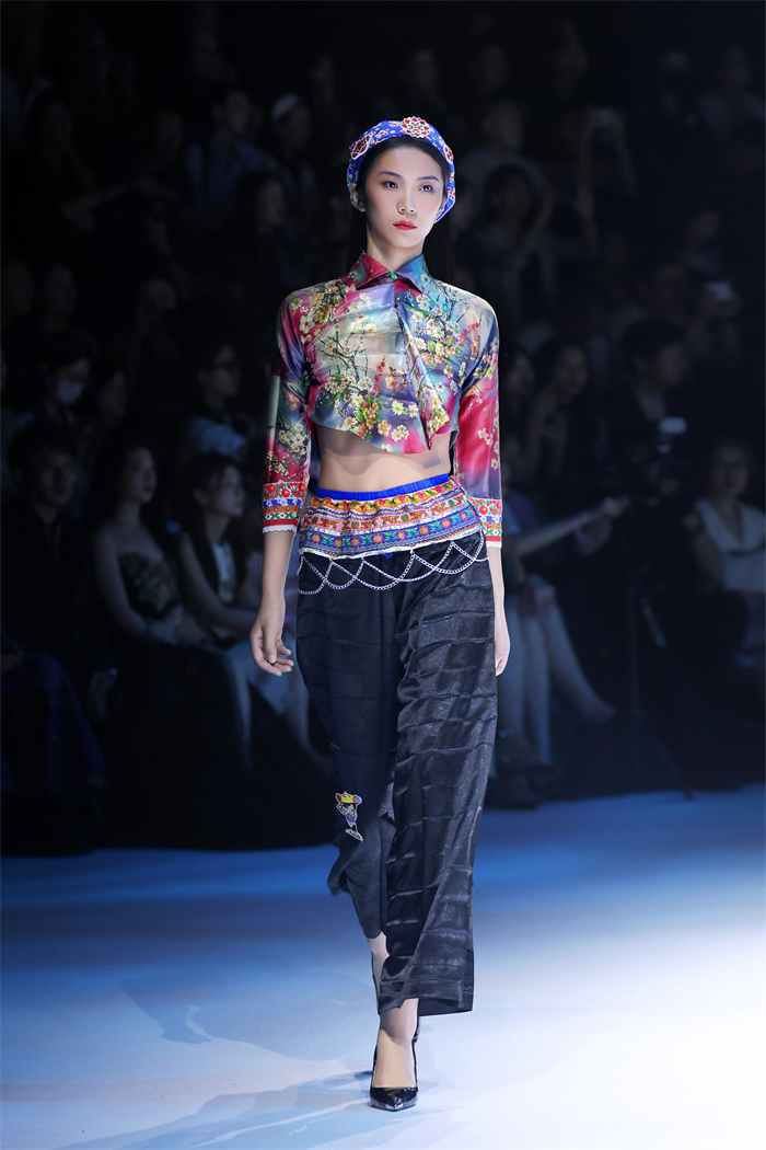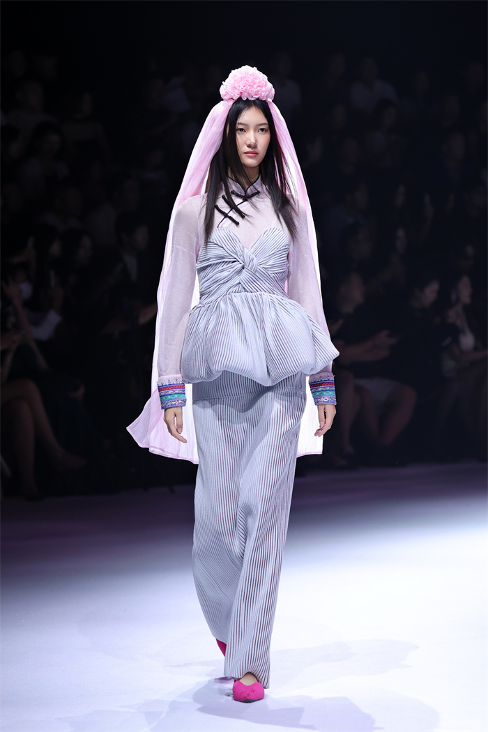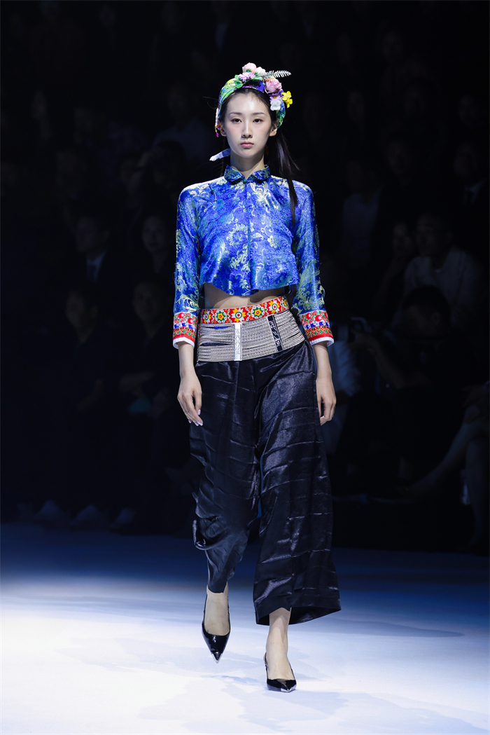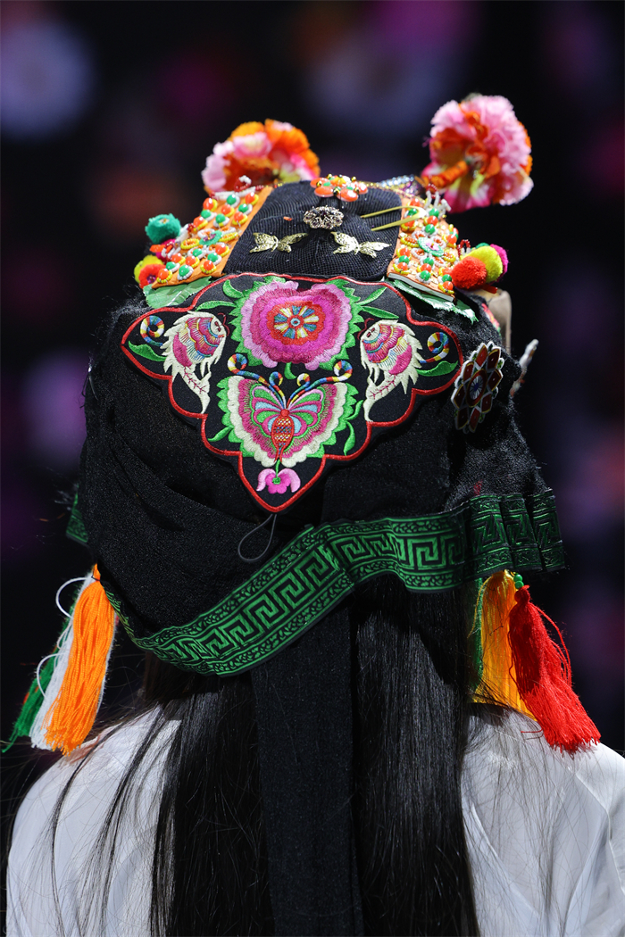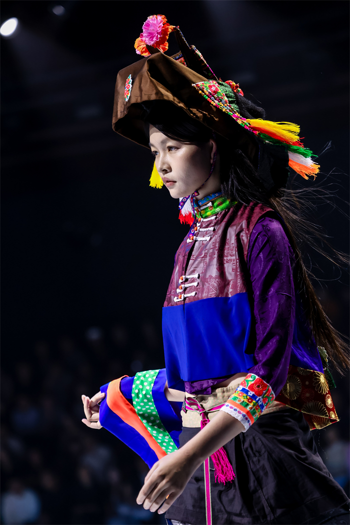 闭幕大秀以“惠女繁花胜似锦”为主题,通过“海、石、花、锦”四个华彩篇章。黄斗笠、花头巾、短上衣、宽筒裤、银腰带等传统惠女服饰元素经设计师陈宇解构重塑,以现代剪裁、创新面料与色彩组合焕发新生。模特步履间,既有传统服饰的质朴底蕴,又不失当代设计的流动与张力。现场沉浸于海浪声、石凿声与闽南乐韵交织的氛围中,感受一场跨越时空的时尚对话。