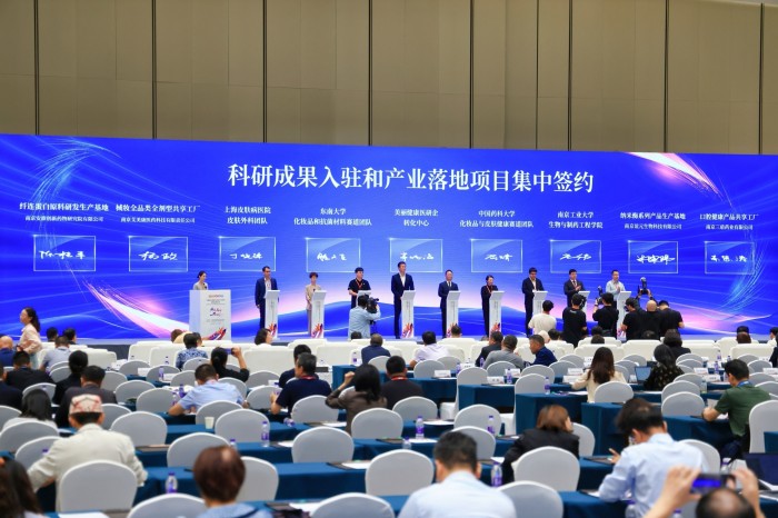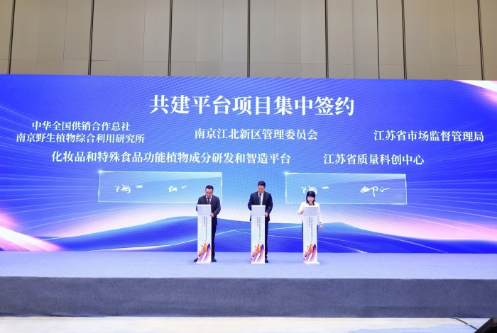 在开幕式上,多组战略合作签约仪式成为焦点。首先进行平台共建项目的签约,江苏省质量科创中心项目由江北新区与江苏省市场监督管理局共建,化妆品功能植物成分研发和智造平台项目由江北新区与南京野生植物综合利用研究所共建。之后,进行了产学研合作项目的集中签约,其中共包含6个合作项目,他们分别是南京野生植物综合利用研究所、纳爱斯集团、山东九鑫、片仔癀、歌锐娜、黄山荷琇、梦娇兰;之后的一批签约项目是产业落地项目,分别有南京江北新区市场监管局、中国药科大学、南京工业大学生物与制药工程学院、上海皮肤病医院、南京集萃医工交叉研究院、南京谊元生物、南京艾美康、南京三盾药业、南京安淮创新药物研究院等机构和企业的落地项目,在现场完成了签约。这些合作签约不仅是政府与企业、机构与企业、企业与企业间的强强联合,更是构建中国香妆产业创新生态的重要举措,持续推动产业的更高质量发展。