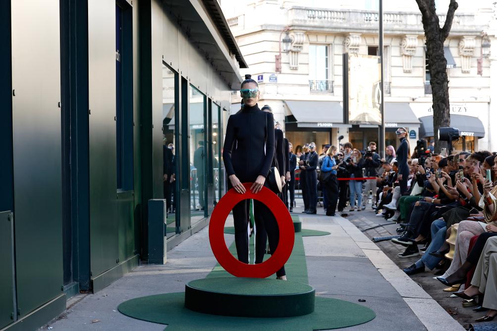 10月7日,模特在法国巴黎时装周上展示皮尔·卡丹品牌2026春夏新品成衣。